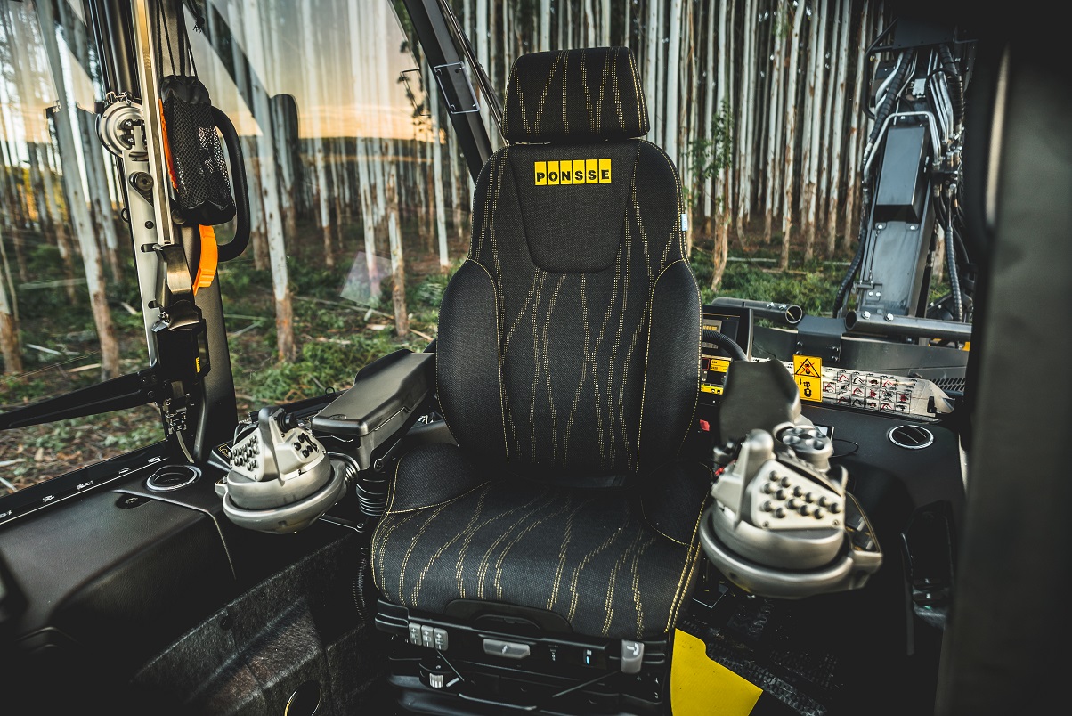 • Assento ergonômico: Todas as máquinas Ponsse apresentam soluções ergonômicas incomparáveis. O principal exemplo é o assento exclusivo Ponsse Seat, que além de confortável, é de fácil manutenção e possui estabilidade superior, minimizando os impactos da máquina sobre o operador.