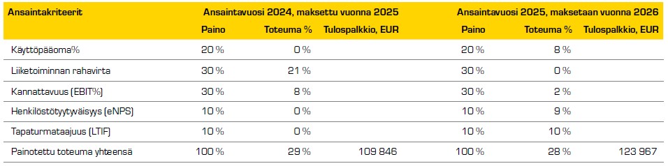 Tilikaudella 2025 toimitusjohtajalle maksettiin tulospalkkio vuoden 2024 mukaisten tavoitteiden saavuttamisen perusteella hallituksen tekemän arvion ja päätöksen mukaisesti 109 846 euroa mikä vastaa 20,2 % vuoden 2024 rahapalkasta ja 41 % tulospalkkion enimmäismäärästä. Vuosittainen tulospalkkio voi olla enintään 50 % edellisen vuoden 2024 rahapalkasta.