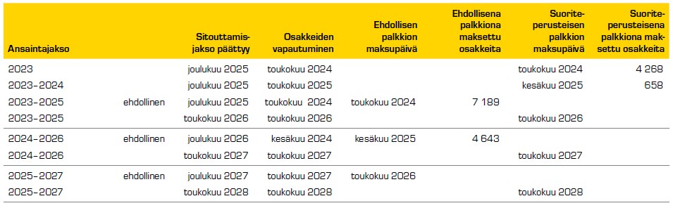Ansaintajaksoilta 2023–2025, 2024–2026 ja 2025–2027 on mahdollista ansaita yhteensä 175 000 osaketta sisältäen myös rahana maksettavan osuuden (bruttopalkkio). Sekä ehdollisten että suoriteperusteisten osakeomistusjärjestelmien vapauttamisehtona on työssäolovelvoite.